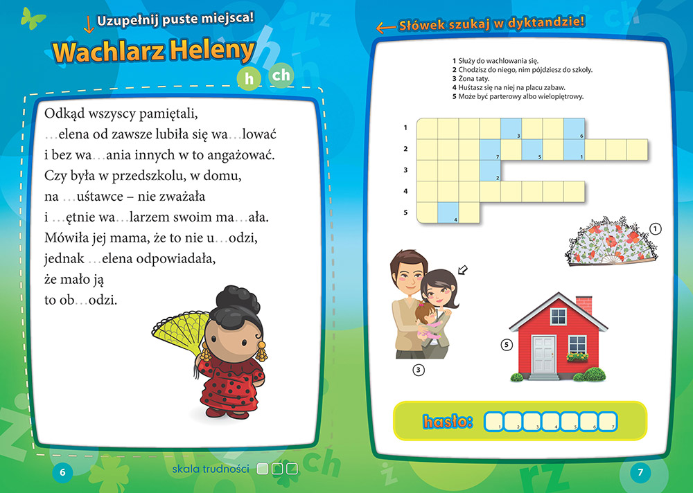 Dyktanda do uzupe³niania mo¿na ³atwo sprawdziæ za pomoc± s³owniczka zamieszczonego na koñcu ksi±¿ki, a po skoñczonej pracy - rozwi±zaæ zabawn± krzy¿ówkê. W drugiej czê¶ci ksi±¿ki znajduj± siê dyktanda do pisania ze s³uchu. Perforowane strony u³atwiaj± wyrwanie kartek. Dziêki nim mo¿na w domu æwiczyæ pisanie dyktand - dok³adnie tak, jak w szkole.
