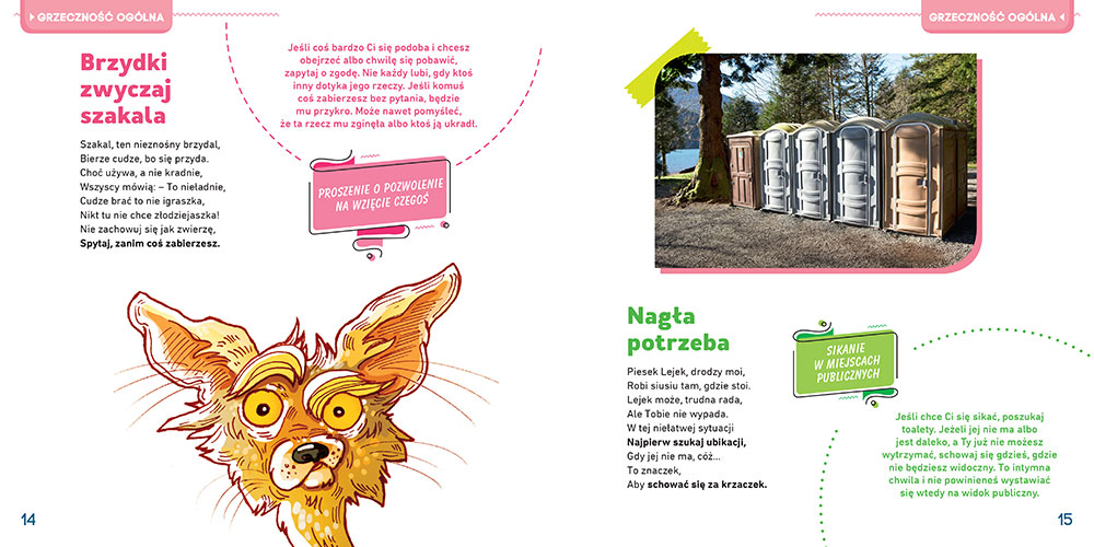 Każdemu wierszykowi towarzyszy kolorowa ilustracja lub zdjęcie oraz komentarz z dodatkowym wyjaśnieniem - nie tylko, jak się zachowywać, ale również dlaczego. Może on stanowić cenną pomoc albo stać się punktem wyjścia do ciekawych rozmów z dzieckiem.