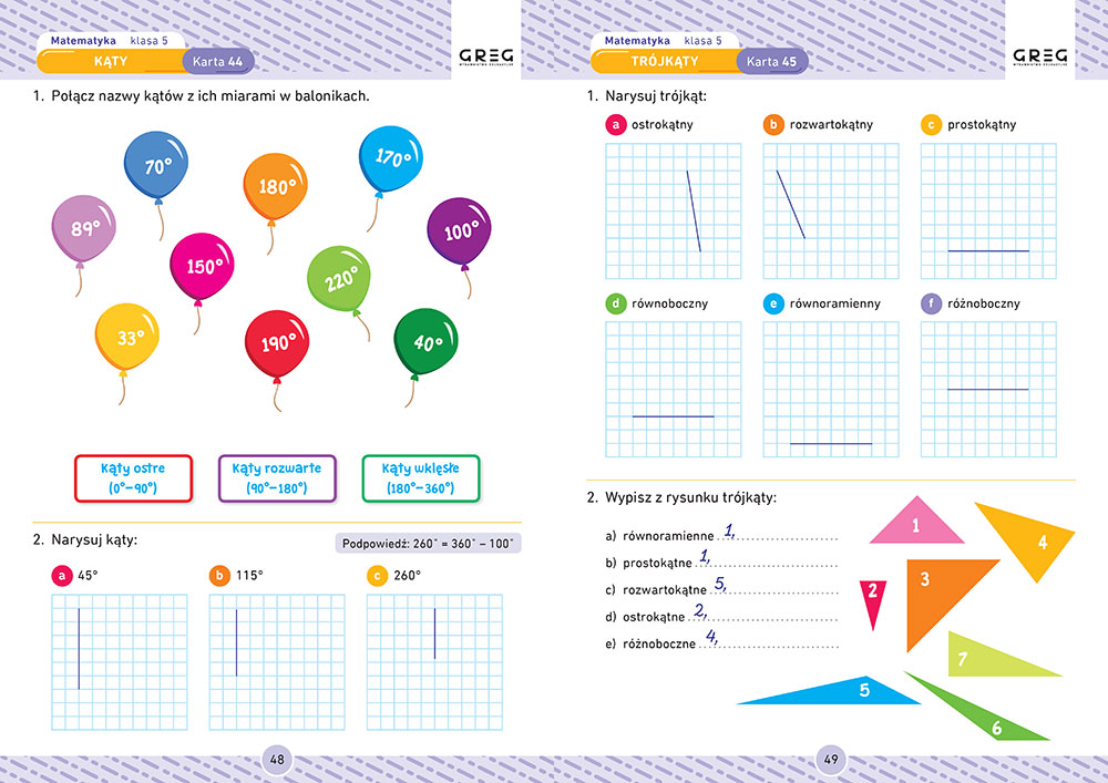 Atutem ca³ej serii kart pracy od Wydawnictwa GREG jest ich nowoczesna i czytelna szata graficzna i wygodna forma ksi±¿ki. Ka¿da strona jest kolorowa, zadania s± estetycznie roz³o¿one, towarzysz± im grafiki, a gdzie to wymagane - tabele, rysunki i wykresy. Ka¿demu zadaniu towarzyszy miejsce na rozwi±zania, odpowiednio du¿e, by zmie¶ci³y siê tam wszystkie obliczenia.