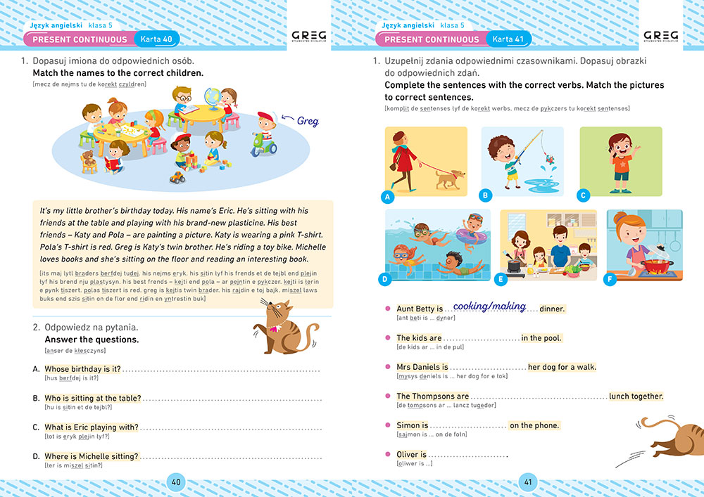 W kartach pracy pojawiaj± siê wszystkie tematy z jêzyka angielskiego, z jakimi uczniowie bêd± mieli okazjê spotkaæ siê w pi±tej klasie. Ksi±¿ka zosta³a podzielona na rozdzia³y poruszaj±ce konkretne tematy (jak rodzina, zawody czy sklepy) i dzia³y gramatyczne (w których pojawiaj± siê wszystkie zagadnienia gramatyczne, na które w ci±gu roku natknie siê pi±toklasista).