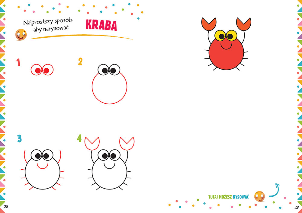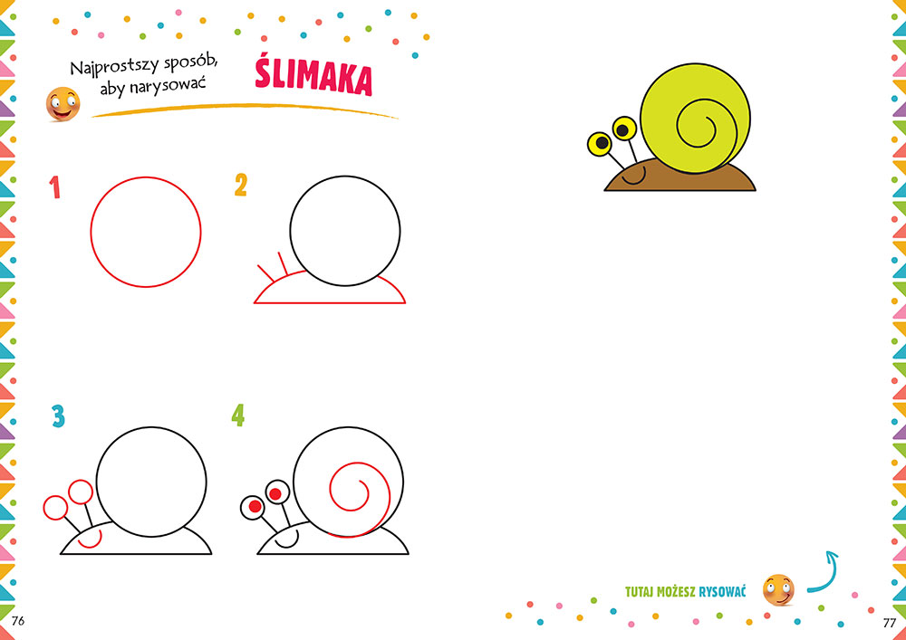 Sposób narysowania danej ilustracji przedstawiony jest po kolei w czterech najprostszych krokach. W każdym z kolejnych etapów rysowania zostały wyraźnie zaznaczone nowe elementy do dorysowania. Dzięki temu każde dziecko samodzielnie będzie w stanie narysować samochód, kotka, lalkę, motocykl czy tygrysa!