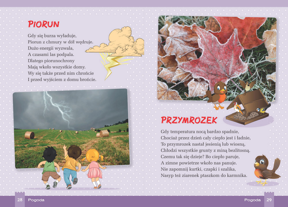 Każdy z rozdziałów opisuje określone zjawiska jego dotyczące, ponadto każdy rozdział oznaczony jest innym kolorem tła, dzięki czemu książka jest bardzo przejrzysta (...) Każde zjawisko i zagadnienie opisane jest w formie krótkiego wierszyka, dzięki czemu w łatwy i zabawny sposób przekazana jest wiedza na takie tematy jak zjawiska pogodowe, pory roku, katastrofy naturalne czy otaczająca nas przyroda.