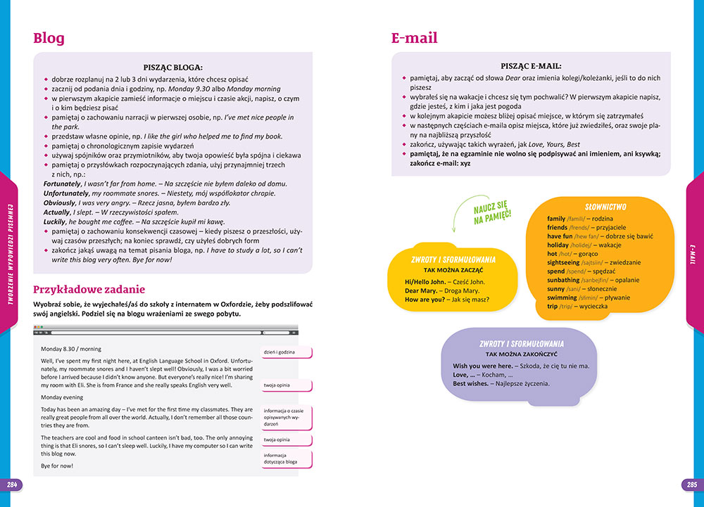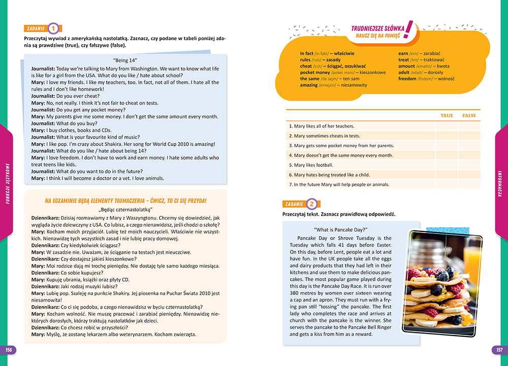 Uczeń znajdzie tu liczne ćwiczenia dotyczące słownictwa z różnych dziedzin, ćwiczenia gramatyczne wraz ze starannie wytłumaczoną teorią, dział językowy omawiający codzienne sytuacje komunikacyjne. Zadbano o to, by ćwiczenia odwzorowywały wszystkie typy zadań, jakie pojawiają się na sprawdzianach i egzaminach.