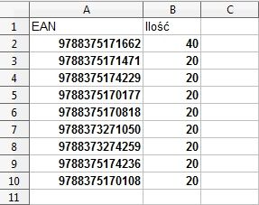 - Wymagane kolumny to: kod EAN lub ISBN lub kod Wydawnictwa GREG oraz liczba zamawianych sztuk (zgodna z ilością w paczce). Mogą występować inne kolumny ale są one zbędne.