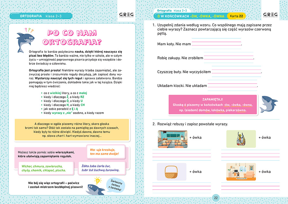 Ortografia. Karty pracy dla klas 2-3 to zbiór æwiczeñ z zakresu poprawnej pisowni, które sprawi±, ¿e ortografia przestanie byæ trudna. Karty pracy zwieraj± nie tylko zadania, ale te¿ cenne wskazówki, które pomog± je rozwi±zaæ oraz zapamiêtaæ regu³y pisowni. Na koñcu znajduje siê s³owniczek ze wszystkimi potrzebnymi wyrazami. Jedna karta z zadaniami dziennie nie zniechêca ogromem pracy, a regularne æwiczenia przynosz± trwa³e efekty.