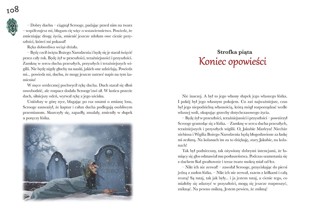Ebenezera Scrooge’a chyba nikomu nie trzeba przedstawiać. Ten nieprzyjemny, zrzędliwy, chciwy starzec w pewną Bożonarodzeniową noc przeżył coś, co odmieniło go zupełnie i uczyniło innym człowiekiem. Nigdy nie wierzył w sens Świąt Bożego Narodzenia, ale niespodziewani goście, którzy go odwiedzili, sprawili, że sens ten objawił się przed nim w całej pełni.