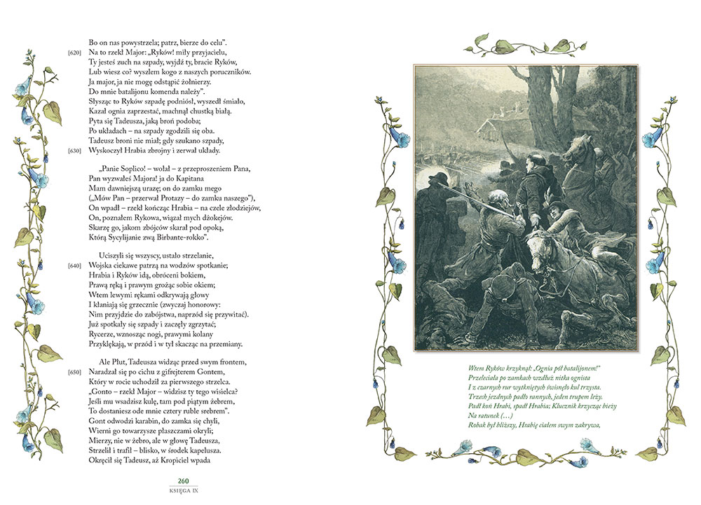 Wyjątkowa edycja epopei narodowej Pan Tadeusz została wzbogacona o niepowtarzalne ilustracje Michała Elwiro Andriollego z 1882 roku. Te oddające ducha epoki ilustracje doskonale prezentują sielankowy czar Soplicowskiego dworku, ukazując niezapomnianych bohaterów i wspaniałą przyrodę litewskich borów. Adam Mickiewicz przedstawił w Panu Tadeuszu zmierzch Polski szlacheckiej. Bohaterów swoich przedstawił z sympatią ukazując polskie tradycje i zwyczaje, piękno ojczystej przyrody.