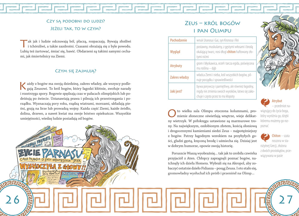 Publikacja opisuje w jasny i przystępny sposób losy bogiń, bogów oraz wielu herosów, nimf czy przerażających stworzeń. Humorystyczne ilustracje i klarowne opisy sprawiają, że w łatwy i przyjemny sposób można przyswoić sobie zawarte w książce informacje. Potężny Olimp staje przed nami otworem, a waleczny Herakles, dzielny Tezeusz i niestrudzony Odyseusz zaciekawiają swoimi burzliwymi losami podczas lektury. Lucyna Szary stworzyła bardzo ciekawą książkę dla młodego czytelnika. Pozycja ta potrafi bawić i uczyć jednocześnie, co jak najbardziej zasługuje na duży plus.