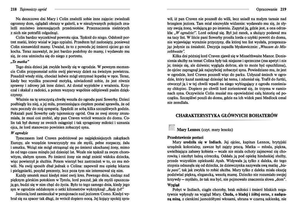 Wydanie Tajemniczego ogrodu kompletne bez skrótów i cięć w treści. W tym wydaniu znajdziesz odpowiedzi na pytania z podręcznika - „pewniak na teście”, czyli wskazanie zagadnień, które zwykle pojawiają się w pytaniach z danej lektury we wszelkich testach sprawdzających wiedzę, a także w podręcznikach i na klasówkach. Książka zawiera pełen tekst lektury. Na końcu książki zamieszczono opracowanie, w którym znajduje się bardzo szczegółowe streszczenie oraz drugie skrócone, ułatwiające szybkie przygotowanie się przed lekcją. Opracowanie zawiera ponadto plan wydarzeń, wnikliwie wyjaśnioną problematykę oraz szerokie charakterystyki bohaterów.