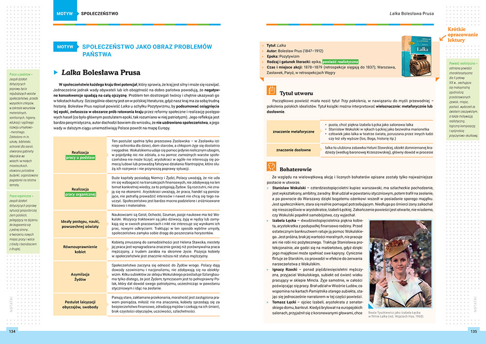 Książka została dostosowana do założeń nowej podstawy programowej, która kładzie szczególny nacisk na to, by uczeń potrafił swobodnie operować motywami literackimi, zestawiać ze sobą lektury, dostrzegać nawiązania między nimi i budować siatkę skojarzeń. Z tego względu omówienia lektur w niej nie są ułożone chronologicznie, lecz zebrane w grupy według motywów. Omówiono wszystkie najbardziej popularne w szkolnej praktyce motywy, takie jak bunt, wady narodowe, matka, ojciec, rewolucja, wojna, śmierć i wiele innych, a główny nacisk został położony na realizację danego motywu w utworze. Rzecz jasna nie zapomniano też o streszczeniach, omówieniu tytułu, czasu i miejsca akcji oraz najważniejszych bohaterów. Atutem są też dokładniejsze, bardziej szczegółowe streszczenia dostępne pod kodami QR. Nowoczesna oprawa graficzna ułatwia pracę z książką.