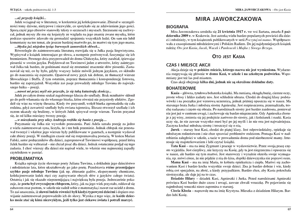 Znajdują się tutaj dokładne streszczenia, charakterystyki bohaterów, plany wydarzeń, problematyki, a także krótkie notki biograficzne autorów. Zadbano o to, by nie zniechęcić małych uczniów do nauki, dlatego wszystkie teksty są napisane bardzo prostym, zrozumiałym językiem, bez użycia trudnych terminów i pojęć, krótkie i treściwe, by dziecku łatwo było zapamiętać wszystkie wymagane informacje.