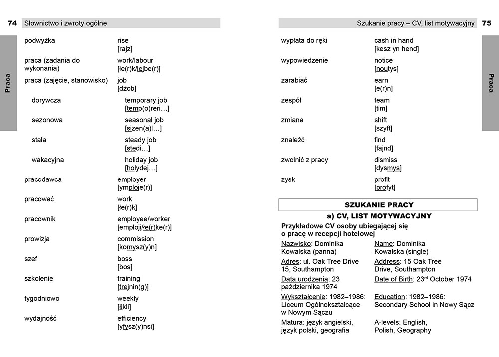 Atutem jest przejrzysty układ pozwalający na błyskawiczne orientowanie się w książce, a przede wszystkim fonetyczna wymowa wszystkich słówek i wyrażeń, dzięki którym nawet początkujący użytkownicy języka angielskiego nie będą mieli kłopotów z wymową. Dołączono też przykładowe CV i list motywacyjny, które mogą przydać się za granicą jako wzór, jak sporządzić własne dokumenty.